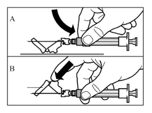 - Paina ruiskun mäntää tasaisella paineella, kunnes ruisku on tyhjä. Vedä neula pistoskohdasta ja aktivoi turvainjektioneulassa oleva turvasuojus (kuten vaiheessa 9 näytetään).