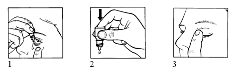 - Paina kevyesti pullon pohjaa ja tiputa yksi tippa lääkevalmistetta silmään kerrallaan (kuva 2)