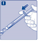 - Pidä männänvartta alas painettuna ja pyöritä injektiopulloa varovasti, kunnes kuiva-aine on kokonaan liuennut.