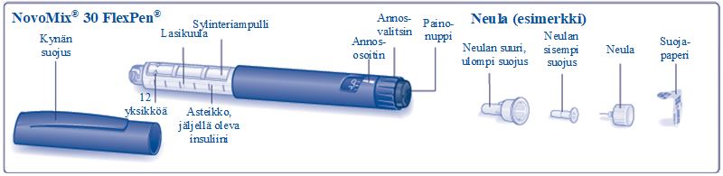 NovoMix® 30 FlexPen® 100 yksikköä/ml injektioneste, suspensio, esitäytetty kynä30 % liukenevaa aspartinsuliinia ja 70 % protamiinilla kiteytettyä aspartinsuliinia
