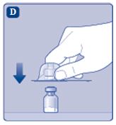 4. Liuota kuiva-aine liuottimella - Pidä esitäytettyä ruiskua hieman kallellaan injektiopullon osoittaessa alaspäin.