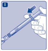 - Ota injektiopullo, injektiopulloliitin ja esitäytetty ruisku pois kotelosta. Jätä männänvarsi koskemattomana koteloon.
