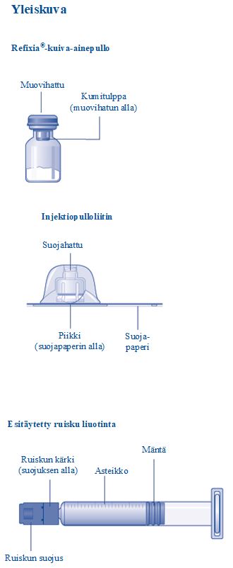 - Refixia® on injektiokuiva-aine ja liuotin, liuosta varten (500 IU:n, 1 000 IU:n, 2 000 IU:n tai 3 000 IU:n kuiva-aine injektiopullossa ja 4 ml liuotinta esitäytetyssä ruiskussa, männänvarsi ja injektiopulloliitin – pakkauskoko on 1).