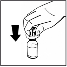 - Pane injektiokuiva-ainepullo tasaiselle alustalle ja pidä sitä paikoillaan. Ota adapteripakkaus ja aseta injektiopullon adapteri injektiokuiva-ainepullon kumisen tulpan keskikohdan päälle. Paina adapteripakkausta lujasti alaspäin, kunnes adapterin kärki puhkaisee kumitulpan. Adapteri napsahtaa kiinni injektiopulloon.