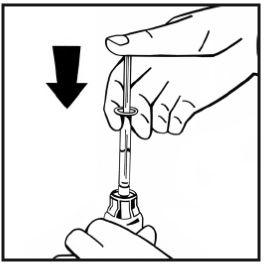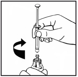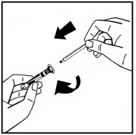 - Vedä esitäytetyn ruiskun pakkauksen paperinen suojapäällinen pois. Pidä kiinni ruiskun männän päästä äläkä koske männän varteen. Kiinnitä ruiskun männän kierteinen pää liuotinruiskuun. Kierrä mäntää myötäpäivään, kunnes tunnet pienen vastuksen.