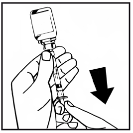 - Käännä ruiskuun kiinnitetty injektiopullo ylösalaisin ja vedä valmis liuos hitaasti ruiskuun. Varmista, että kaikki injektiopullon sisältö siirtyy ruiskuun.