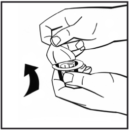 - Katkaise liuotinruiskun suojattu muovipää korkin perforoinnin kohdalta. Älä koske korkin sisäpuoleen äläkä ruiskun päähän. Jos liuosta ei käytetä heti, sulje täytetty ruisku muovisella suojakärjellä säilytystä varten.