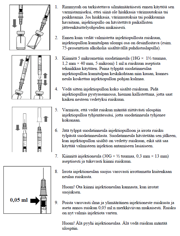 Valmistellessasi Rimmyrah-valmistetta annettavaksi aikuispotilaille silmän lasiaiseen, noudata seuraavia ohjeita.