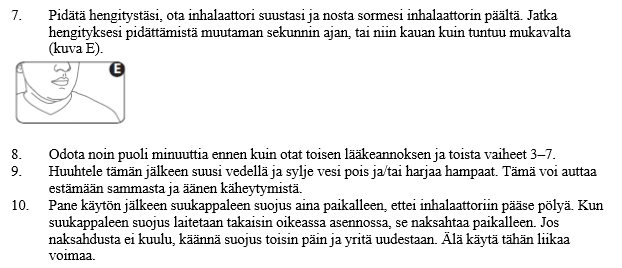 Älä kiirehdi vaiheissa 4, 5, 6 ja 7. On tärkeää, että alat hengittää sisään mahdollisimman hitaasti juuri ennen inhalaattorin käyttöä. Käytä inhalaattoria muutamalla ensimmäisellä kerralla seisoessasi peilin edessä. Jos inhalaattorin yläosasta tai suupielistäsi näyttää tulevan "sumua", aloita uudelleen kohdasta Miten valmistetta käytetään.