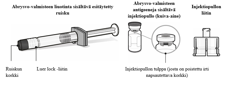 Abrysvo-valmisteen antigeenit (kuiva-aineen) sisältävän injektiopullon, liuottimen sisältävän esitäytetyn ruiskun ja injektiopullon liittimen käyttö