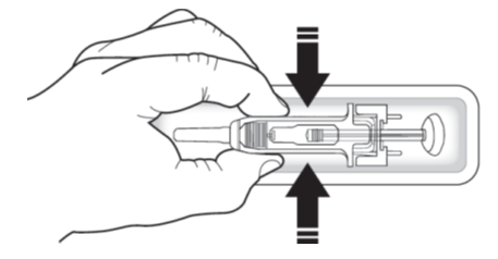 - Avaa esitäytetyn ruiskun läpipainopakkaus vetämällä läpipainopakkauksen kansi irti. Ota esitäytetty ruisku läpipainopakkauksesta tarttumalla ruiskun keskiosaan.