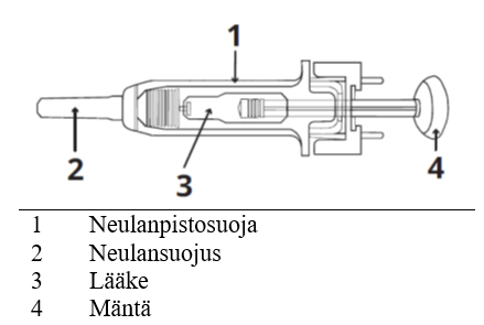 Tarkista ruisku varmistaaksesi, että neulanpistosuoja on esitäytetyn ruiskun keskiosan päällä. Älä työnnä neulanpistosuojaa neulansuojuksen yli ennen pistoksen antamista. Se voi aktivoida tai lukita neulanpistosuojan. Jos neulanpistosuoja peittää neulan, neulanpistosuoja on aktivoitunut.