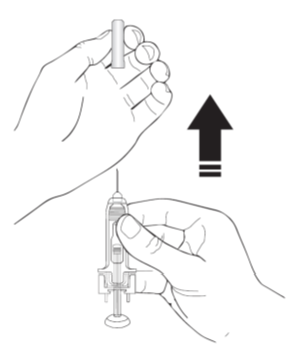 8. Pidä kiinni ruiskun keskiosasta ja poista neulansuojus vetämällä sitä varovasti ja kiertämättä suoraan pois päin vartalostasi. Hävitä neulansuojus. Älä laita neulansuojusta takaisin paikalleen. Älä paina mäntää, koske neulaan tai ravista ruiskua.