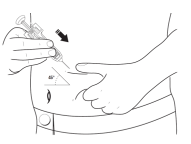 12. Pidä esitäytettyä ruiskua toisessa kädessäsi kuin pitelisit kynää. Työnnä neula ihoon nopealla liikkeellä noin 45 asteen kulmassa kuvassa esitetyllä tavalla.