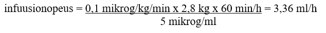 Esimerkki: 2,8-kiloiselle vastasyntyneelle annettava 0,1 mikrog/kg/min alprostadiilia, kun käytettävä loppupitoisuus on 5 mikrog/ml: