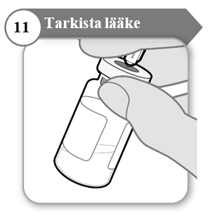- Pidä neula injektiopullossa ja tarkista lääke huolellisesti. Sen pitää olla kirkasta eikä hiukkasia saa näkyä.