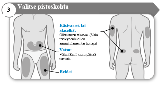 - Vältä luun kohdalla olevia ihoalueita. Vältä myös ihoalueita, jotka ovat mustelmilla, punoittavat, aristavat tai tuntuvat kovilta, tai joissa on arpia tai ihosairauksia.