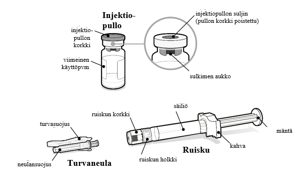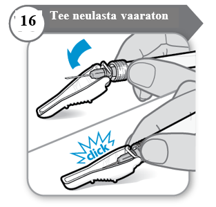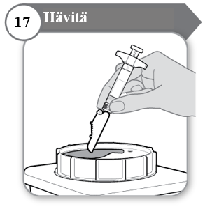 - Ruiskua ja neulaa EI SAA KOSKAAN käyttää uudelleen. Hävitä neula ja ruisku lääkärin, sairaanhoitajan tai apteekin ohjeiden mukaisesti ja paikallisten terveys- ja turvallisuuslakien mukaisesti.
