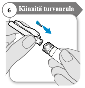 - Kierrä turvaneula tiukasti kiinni ruiskuun niin pitkälle kuin se menee.