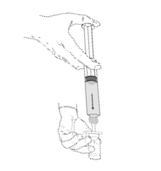 5. Käännä injektiopullo ja ruisku ylösalaisin ja vedä kaikki liuos injektiopullosta ruiskuun.