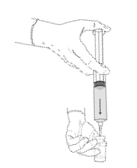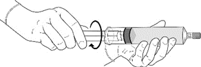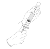 6. Irrota tyhjä injektiopullo ja Mini-Spike siirtolaite ruiskusta ja hävitä injektiopullo sekä Mini-Spike siirtolaite. Peitä ruisku ruiskun suojuksella. Sekoita ruiskun sisältö varovasti.