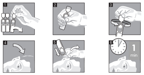 - Pidä päätä kallellaan noin yhden minuutin ajan, jotta lääke ehtii leviämään korvaan (kuva 6). Hävitä kerta-annospakkaus annostelun jälkeen.