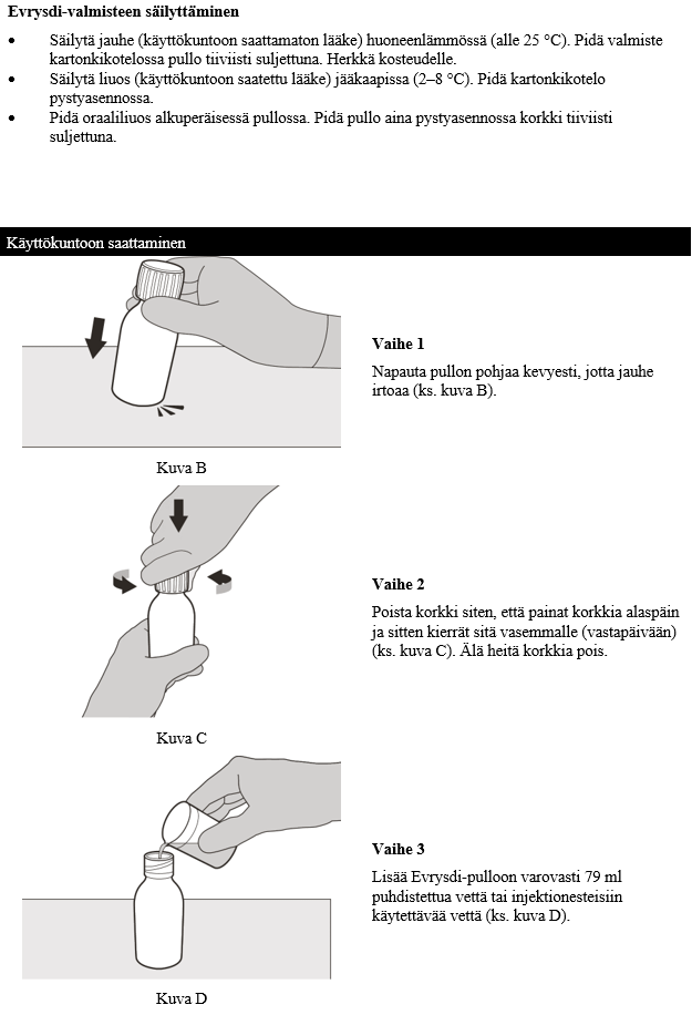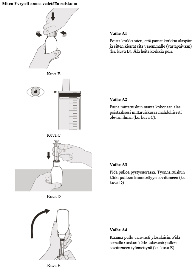 Lue myös huolellisesti Käyttöohjeet-osio siitä, miten Evrysdi-valmistetta otetaan tai miten sitä annetaan, ja noudata annettuja ohjeita.