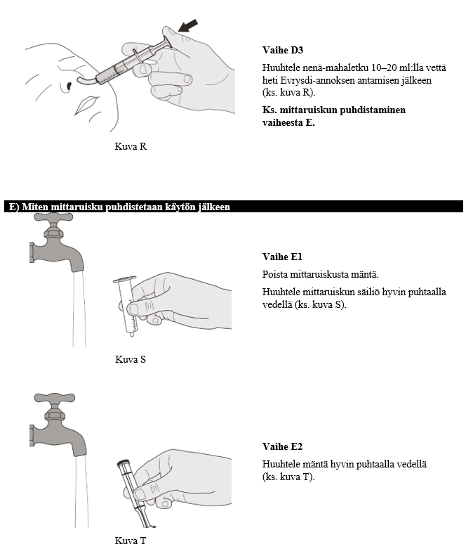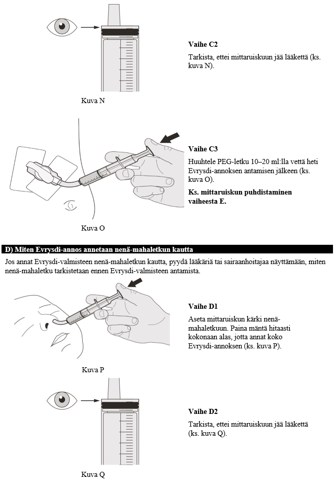 Lue käyttöohjeet ennen Evrysdi-valmisteen käytön aloittamista. Ohjeissa opastetaan, miten Evrysdi-annos valmistellaan ja annetaan mittaruiskulla tai PEG-letkun tai nenä-mahaletkun kautta.