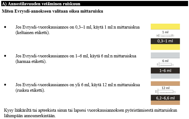 - Ks. Miten Evrysdi-annokseen valitaan oikea mittaruisku. Jos sinulla on kysyttävää oikean mittaruiskun valitsemisesta, käänny apteekkihenkilökunnan puoleen.