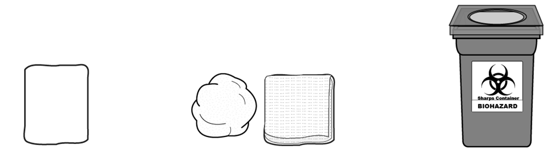 Desinfiointipyyhkeet | Steriili pumpulituppo tai sideharsotaitos | Pistävän ja viiltävän jätteen keräysastia neulojen ja käytetyn ruiskun hävittämiseen turvallisesti |