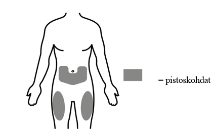 - Suositeltuja pistoskohtia ovat reiden yläosa tai vatsan alaosa navan alapuolella.