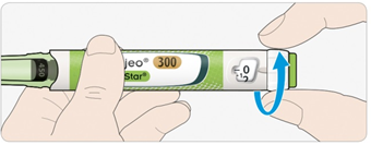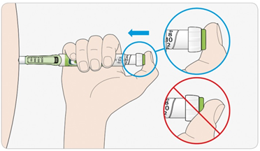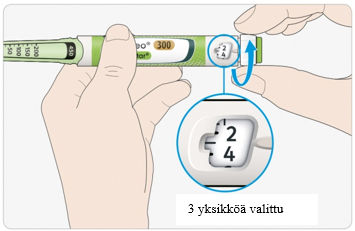 - Jos kynässäsi ei ole tarpeeksi yksiköitä jäljellä annostasi varten, annoksenvalitsija pysähtyy sen numeron kohdalle, joka osoittaa jäljellä olevien yksiköiden määrän.