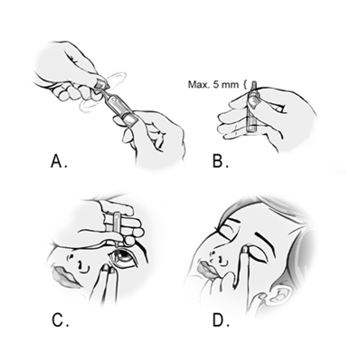 - Taivuta päätäsi taaksepäin tai käy makuulle. Aseta kätesi otsalle. Etusormen pitää olla kulmakarvan tasalla tai nojata nenänselkään. Katso ylöspäin. Vedä alaluomea alaspäin toisella kädellä. Älä anna minkään kerta-annospakkauksen osan koskettaa silmää tai silmiä ympäröivää aluetta. Purista kerta-annospakkausta varovasti ja anna yhden tipan pudota silmäluomen ja silmän väliseen tilaan. (Kuva C). Älä räpytä silmää tiputuksen aikana. Yhden kerta-annospakkauksen sisältämä liuos riittää kumpaankin silmään.