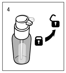 Annospumpun päätä ei saa painaa, kun se on kiinni -asennossa. Oraaliliuosta voi annostella vain pumpun ollessa auki -asennossa. Kun haluat avata pumpun, käännä pumpun päätä nuolen suuntaan, kunnes se ei enää mene pidemmälle (noin kahdeksasosa kierrosta, kuva 4). Sitten annospumppu on valmis käyttöön.