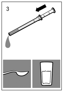 Liuosta ei saa pipetoida pullosta suoraan suuhun. Liuos annostellaan pipetillä lusikkaan tai vesilasiin (kuva 3).