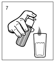 Heitä pumpusta tässä vaiheessa tuleva oraaliliuos pois. Kun painat pumpun pään seuraavan kerran pohjaan asti (vastaa yhtä pumpun painallusta), pumpusta tulee oikeansuuruinen annos (kuva 6).
