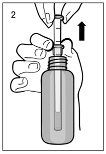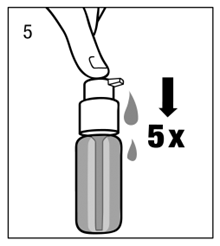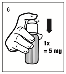Annospumpusta ei vielä ensimmäisellä pumpun painalluksella tule oikeaa oraaliliuosannosta. Siksi pumppu täytyy valmistella käyttöön painamalla sen pää pohjaan saakka viisi kertaa peräkkäin (kuva 5).