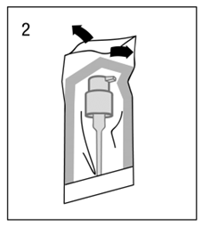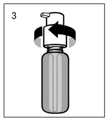 Ota annospumppu muovipussista (kuva 2) ja aseta se pullon päälle. Työnnä muovinen nousuputki varovasti pulloon. Kierrä annospumppu myötäpäivään lujasti kiinni pullonkaulaan (kuva 3). Annospumppu kierretään paikalleen vain kerran käytön alussa, eikä sitä pidä irrottaa.