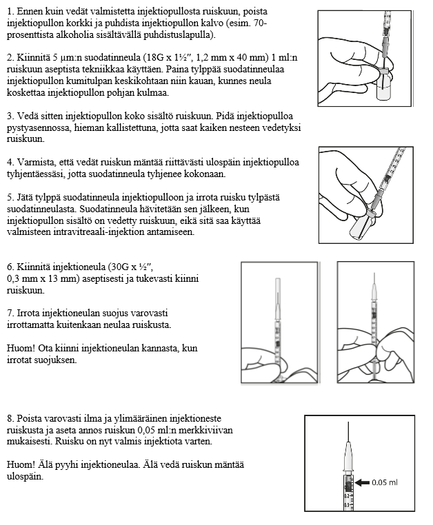 Injektio on annettava aseptisissa olosuhteissa, mikä tarkoittaa kirurgista käsien desinfiointia, steriilien käsineiden, steriilien suojavaatteiden ja steriilin luomilevittimen (tai vastaavan) käyttöä ja tarvittaessa mahdollisuutta steriiliin parasenteesiin. Potilaan aiemmat yliherkkyysreaktiot on selvitettävä tarkoin ennen intravitreaalista toimenpidettä. Ennen injektiota silmää ympäröivä iho, silmäluomi ja silmän pinta desinfioidaan laajakirjoisella paikallisella mikrobisidilla sekä annetaan riittävä puudutus paikallisen hoitokäytännön mukaisesti.