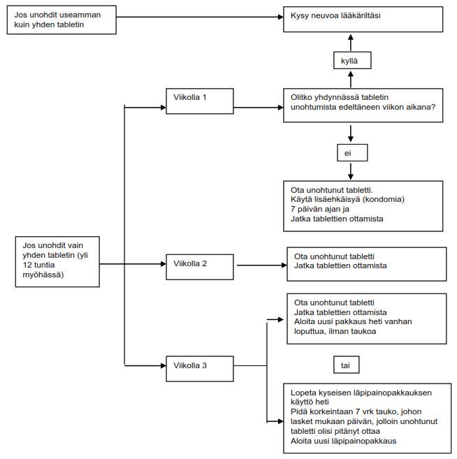 - jos unohdit yhden tabletin viikolla 2 Ota unohtunut tabletti heti, vaikka joutuisitkin ottamaan kaksi tablettia yhtä aikaa. Ota seuraavat tabletit normaalina ottoajankohtana. Tablettien ehkäisyteho säilyy, eikä lisäehkäisyä tarvita.