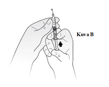 2. Aseta ruisku toisella kädellä niin, että neula osoittaa suoraan ylöspäin kuvan B mukaisesti. Aseta peukalosi männän päälle ja paina hitaasti, kunnes näet pienen nestepisaran neulan kärjessä.