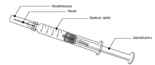 6. Esitäytetty ruisku on nyt valmis käytettäväksi kohtien “Mihin ruiske pitäisi pistää?” ja “Kuinka pistät ruiskeen?” mukaisesti.