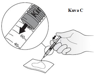 3. Käännä ruiskua niin, että neula osoittaa nyt alaspäin. Aseta steriili lappu tai nenäliina tasaiselle pinnalle ja pidä ruiskua sen yläpuolella neula alaspäin, kuten kuvassa C. Varmista, ettei neula koske lappuun tai nenäliinaan.