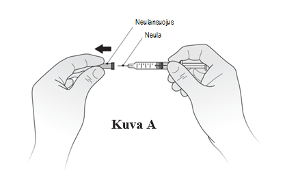 1. Pidä kiinni ruiskusäiliöstä ja poista neulansuojus varovasti. Älä väännä vaan vedä suoraan kuvan A osoittamalla tavalla. Älä koske neulaan äläkä paina mäntää. Hävitä neulansuojus välittömästi.