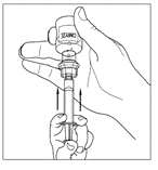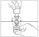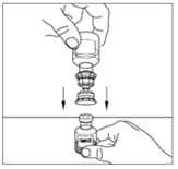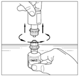 10. Aseta kuiva-ainepullo tasaiselle pinnalle. Kallista annosteluvälinettä ja liuotinpulloa, joka sisältää injektioihin käytettävää vettä, ja työnnä annosteluvälineen paljas pää kuiva-ainepulloon, työntäen sisään kunnes kärki lävistää kumitulpan ja annosteluväline napsahtaa paikoilleen. Annosteluvälineen tulee olla pystysuorassa asennossa ennen kuiva-ainepullon tulpan lävistämistä. Kuiva-ainepullon sisältämä tyhjiö imee liuottimen sisään pulloon. Jos pullossa ei ole tyhjiötä, älä käytä valmistetta. |   |