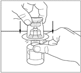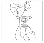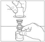 8. Huom.: annosteluväline on kiinnitettävä liuotinpulloon ennen kuin se kiinnitetään kuiva-ainepulloon niin, että injektiopullossa oleva tyhjiö säilyy ennallaan. Aseta liuotinpullo tasaiselle pinnalle ja työnnä annosteluvälineen sininen pää liuotinpulloon, työntäen alaspäin kunnes piikki lävistää liuotinpullon tulpan keskeltä ja väline napsahtaa paikoilleen. Annosteluvälineen tulee olla pystysuorassa asennossa ennen pistämistä tulpan sulkimen läpi. |  |