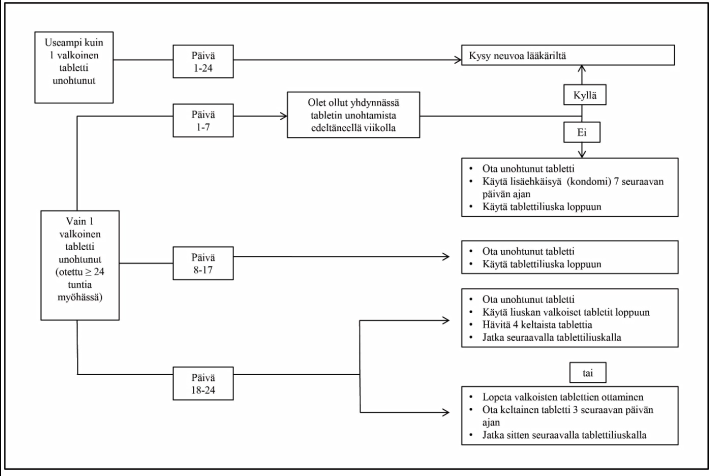 Tässä pakkausselosteessa kuvataan useita tilanteita, joissa ehkäisytablettien käyttö on lopetettava tai joissa niiden ehkäisyteho on saattanut heikentyä. Näissä tilanteissa on pidättäydyttävä yhdynnästä tai käytettävä lisäksi ei-hormonaalista ehkäisymenetelmää, kuten kondomia tai muuta estemenetelmää. Älä käytä rytmimenetelmää tai peruslämmönmittausta. Nämä menetelmät eivät välttämättä estä raskaaksi tulemista, koska ehkäisytablettien käyttö vaikuttaa kuukautiskierron aikana tavallisesti tapahtuviin muutoksiin ruumiinlämmössä ja kohdunkaulan eritteessä.