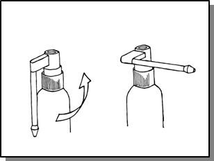 - Jos käytät valmistetta ensimmäistä kertaa, pidä sumutepulloa pystysuorassa ja paina mitta-annostelijaa napakasti peukalolla tai etusormella. Toista 5 kertaa, kunnes muodostuu kunnollinen sumute. Kun käytät valmistetta seuraavan kerran, paina mitta-annostelijaa 2 kertaa.