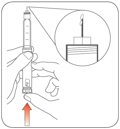 - Håll pennan så att kanylen pekar uppåt. Knacka lätt på ampullhållaren, så att eventuella luftbubblor samlas högst upp i ampullen.