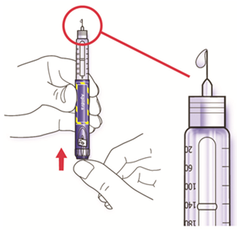E. Tryck in injektionsknappen helt. Kontrollera att insulin syns på nålspetsen.